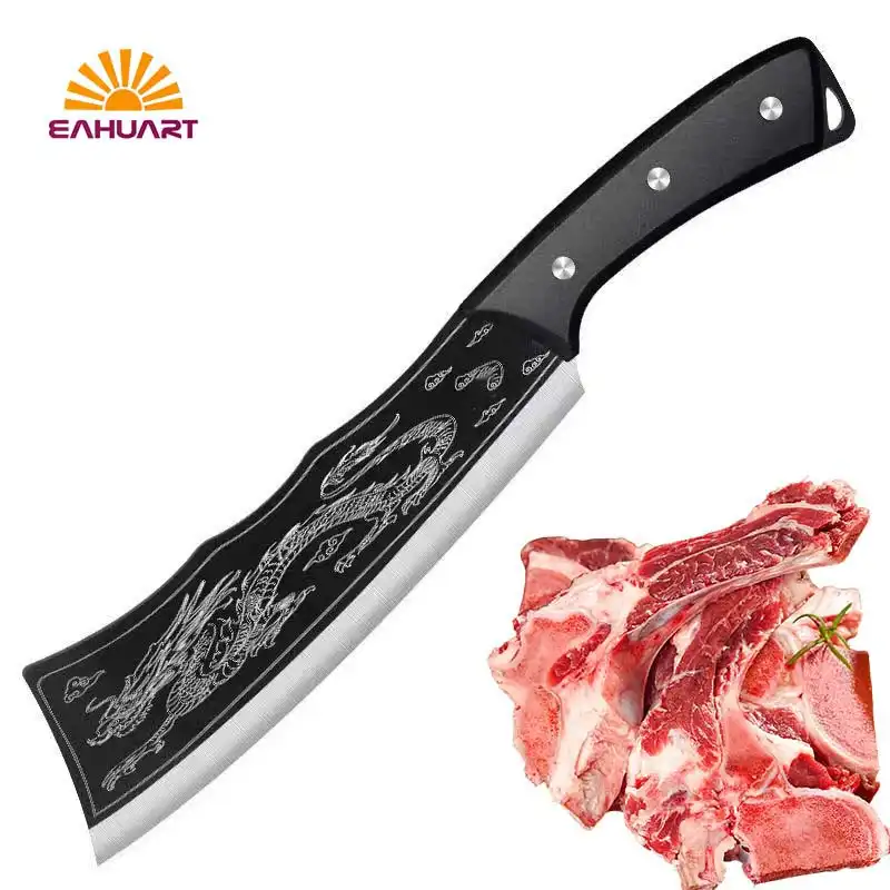 1) A complete butcher knife set usually includes Chef's Knife, Boning Knife, Cleaver, Carving Knife, Utility Knife, etc. Each kind of knife plays a different role in the food processing task, for example, a machete is used to process bones, and a carving knife is used to cut thin slices to show the effect.