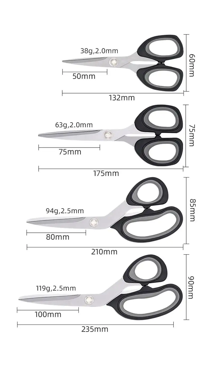 • Premium Material:Crafted from high-grade, rust-resistant stainless steel, every pair of scissors in this multi-size set delivers exceptional sharpness and long-lasting durability. The precision-forged blades retain their cutting edge even with frequent use, resisting dulling when tackling tough materials like leather or thick cardboard, while the stainless steel construction ensures superior corrosion resistance, making them suitable for humid kitchen environments without the risk of rust or discoloration.