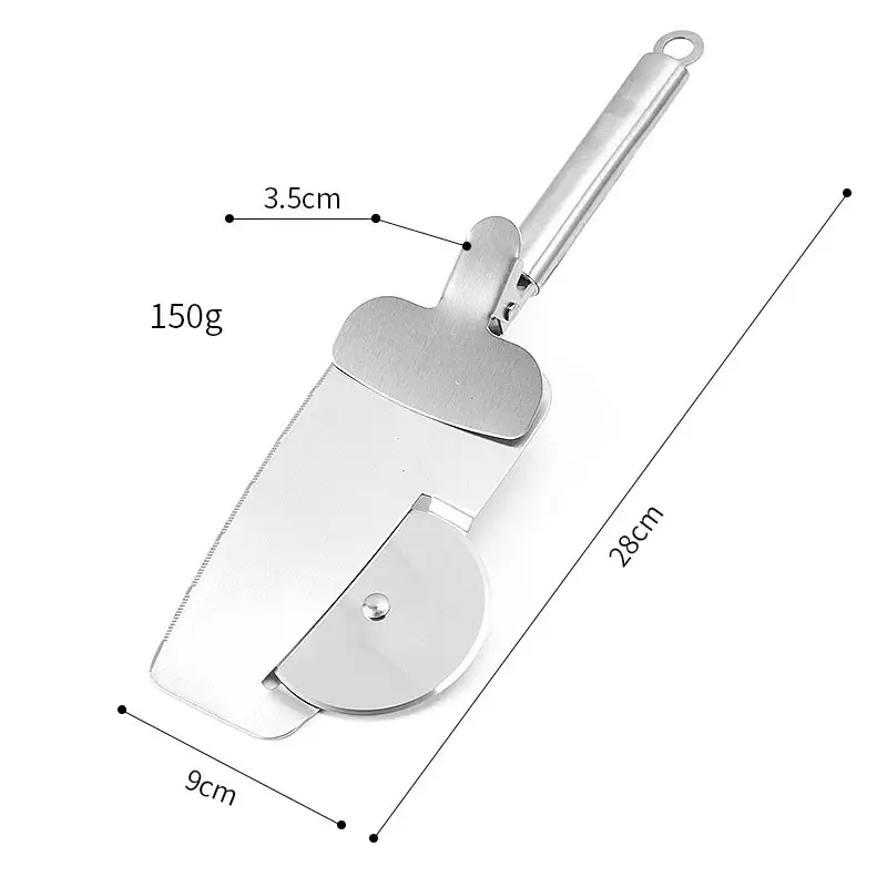 • Premium Material: Made from food-grade stainless steel, both the pizza peel and the built-in wheel cutter are durable, rust-resistant, and built to withstand repeated use and high oven temperatures . The stainless steel peel is thick enough to support heavy pizzas without bending, while remaining lightweight for easy maneuvering.